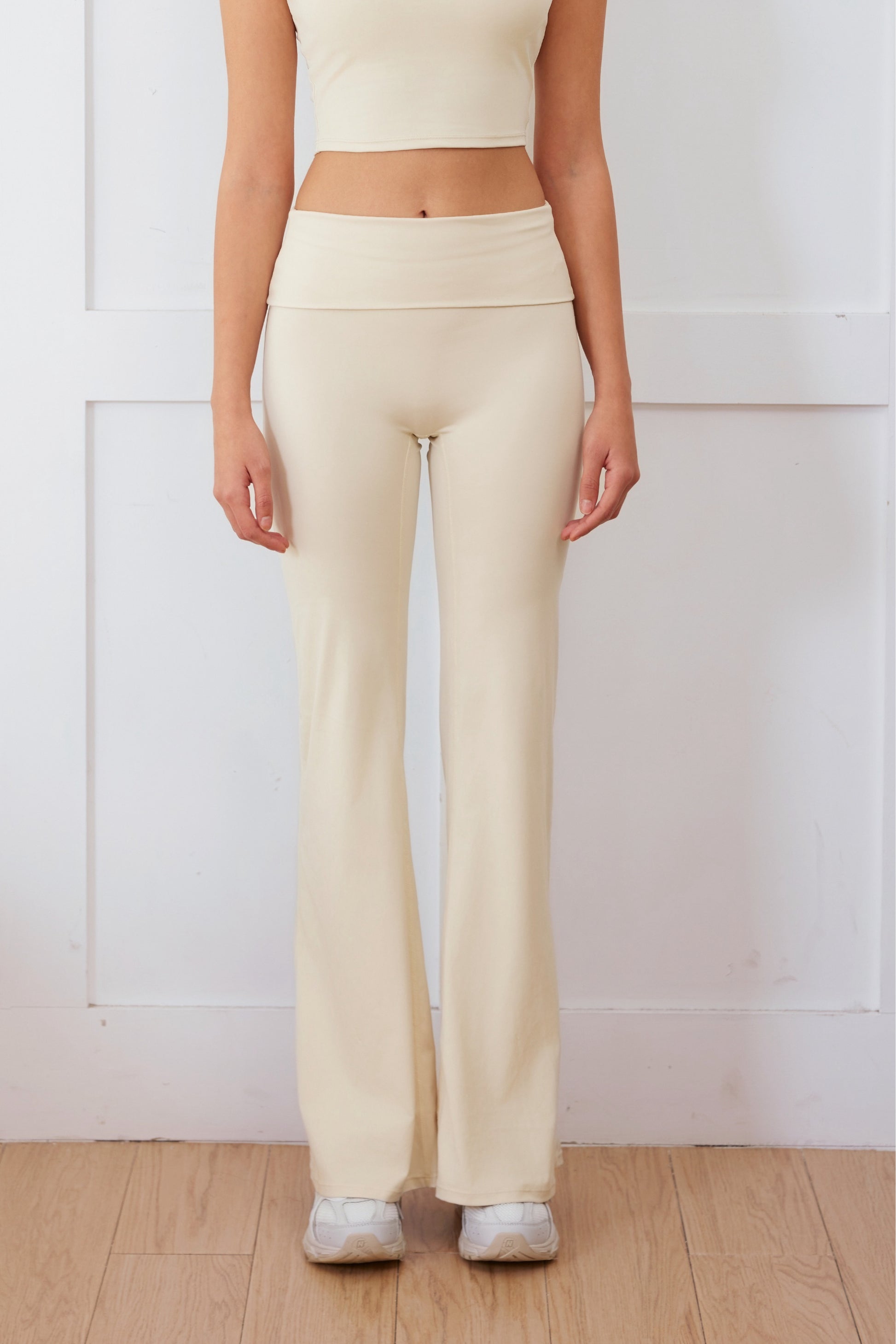 A sculpting pair of flared leggings designed to contour the body while offering effortless comfort and movement. Crafted from soft, double-brushed recycled fabric with a smooth, second-skin feel, they feature a foldover high waistband and a subtle flared hem for a flattering, elongated silhouette. Perfect for studio sessions, lounging, or everyday styling.
