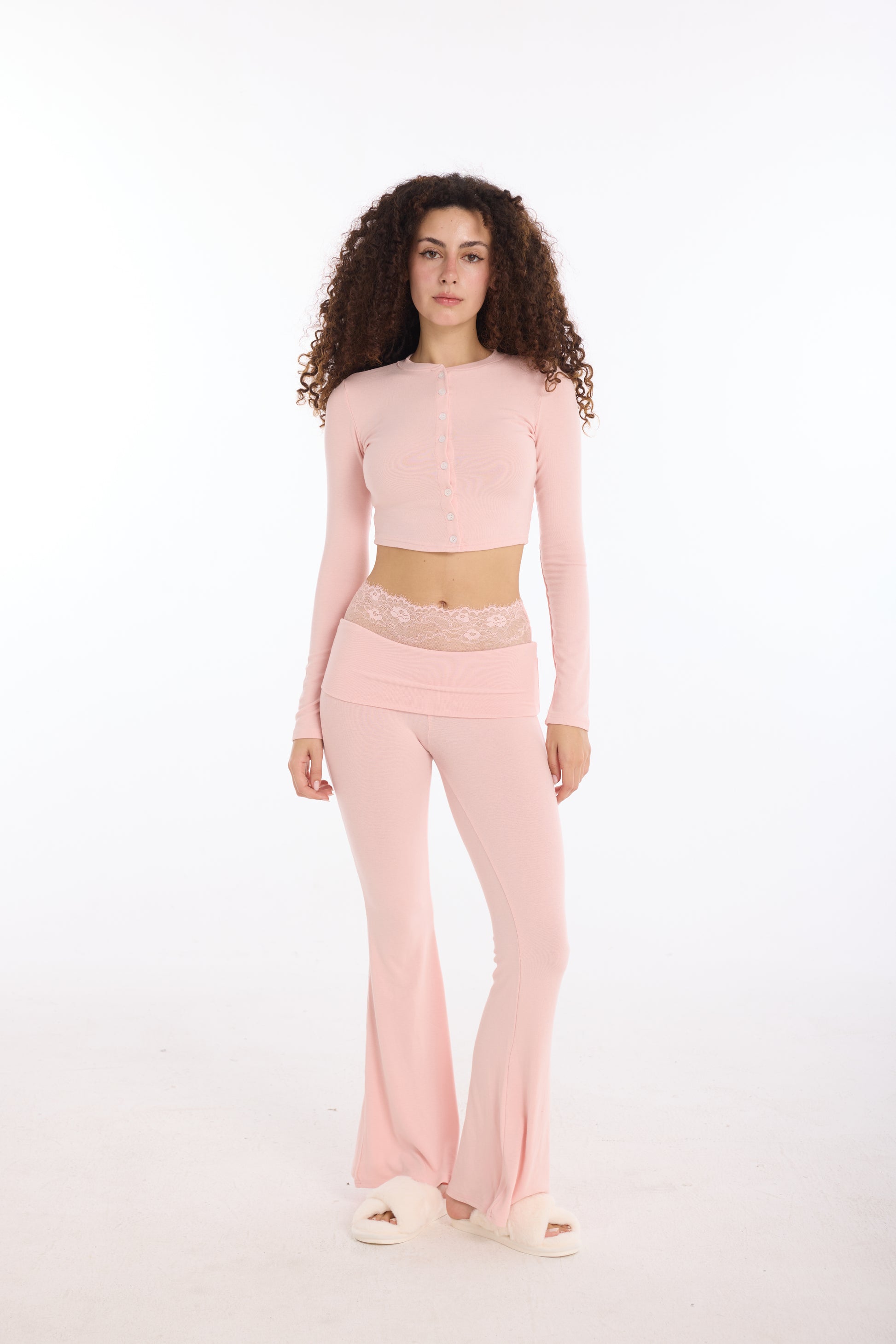 A soft ribbed lounge set designed for effortless comfort and a flattering silhouette. Crafted from a breathable stretch rib fabric, it features a fitted button-up long sleeve top and foldover flared pants with delicate lace trim for a feminine, elevated touch. Perfect for relaxed days at home or casual everyday styling.